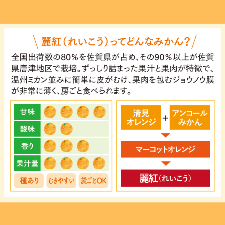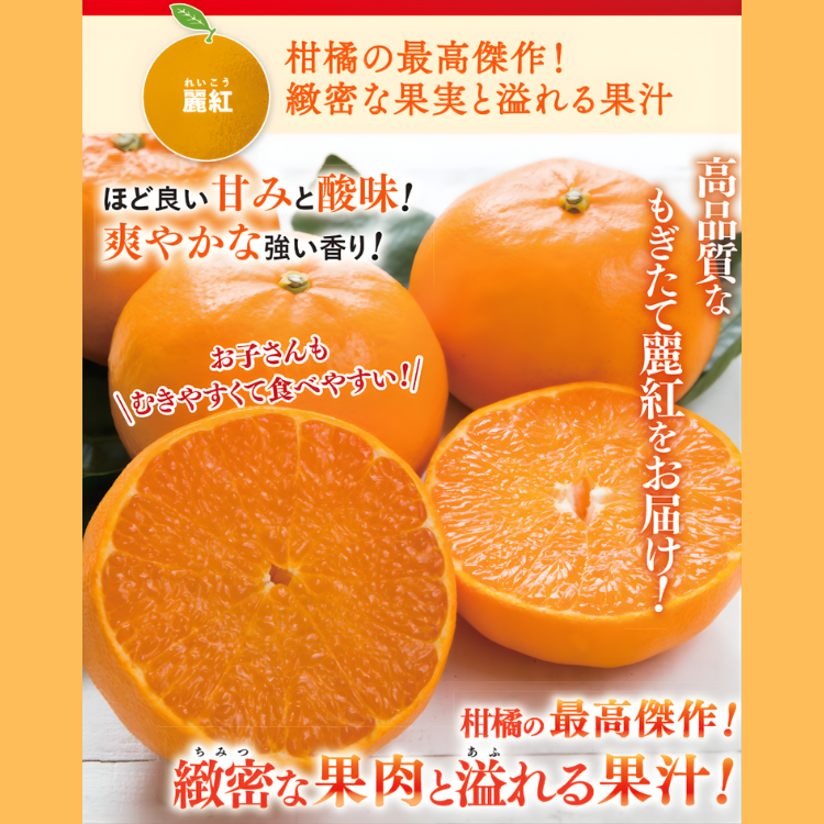 麗紅は「柑橘の大トロ」と呼ばれる高級柑橘のせとかの姉妹品種で、清見オレンジにアンコールみかん、さらにマーコットオレンジを交配して誕生した品種です。全国出荷量の約80%を佐賀県が占め、その90%以上が佐賀県唐津地区で栽培されています。この時季の限られたわずかな期間しか出荷されないため【幻の柑橘】とも言われます。 麗紅の果肉は濃いオレンジ色でずっしりとつまっており、濃厚でコクのある甘みと強い香り、果汁が溢れるほどたっぷりという特長があります。また果皮が薄く、温州みかん並みに簡単に皮がむけ、果肉を包むジョウノウ膜が非常に薄いため房ごと食べることができます。 高品質な秀品、獲れたての『麗紅』を契約農家から直送します。