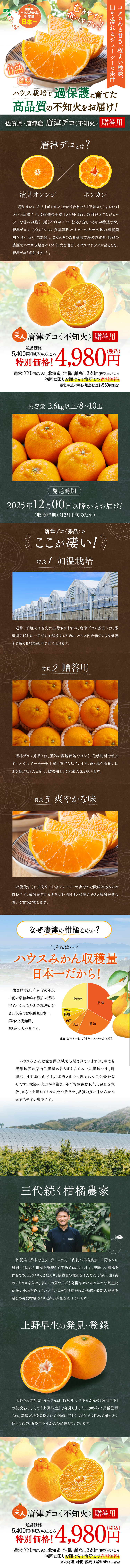 ★2025年12月発送分!★ 2025年11月28日(金)より先着順でご予約スタート! 唐津デコは、コクのある甘さ、程よい酸味、口から溢れるジューシーな果汁が特長で、化学肥料を使わず、佐賀県・唐津のハウスで一玉一玉ていねいに育てられています。 雨・風や虫食いによる傷がほとんどなく、贈答品として大変人気がある逸品です。 柑橘の王様とも呼ばれる不知火を一足早く唐津の農家から直送します! ◆送料無料、北海道・沖縄・離島は送料550円(税込) ※お手数ですが、北海道・沖縄・離島への発送と2箇所以上発送のご注文はお電話にてお申込ください(0120-104-008まで)